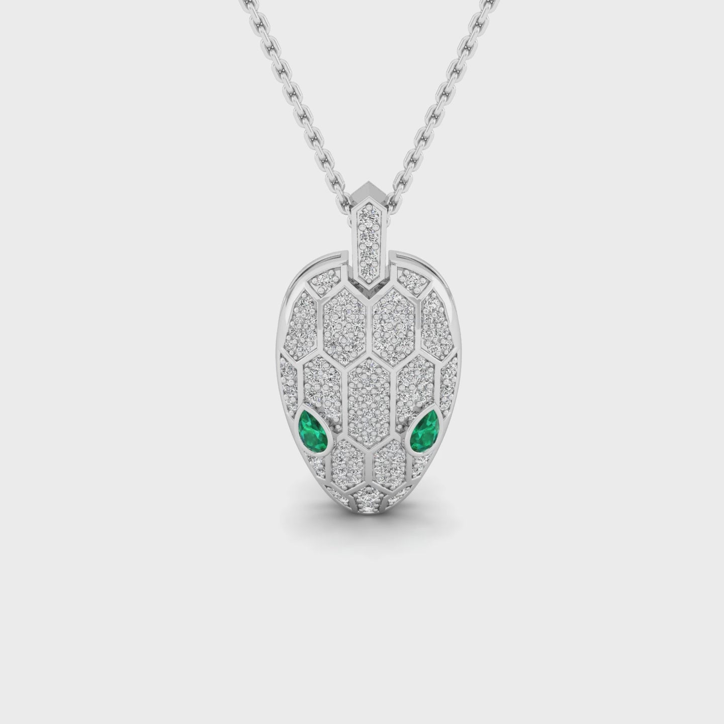 This "Serpens" Pendant is available in 14kt or 18kt gold, offering a choice of two stunning shades - yellow gold and white gold. Forged in gold, this serpent-inspired pendant glistens with 0.8521 ct of round brilliant-cut diamonds, while twin emerald eyes pierce through its geometric scales. Embodying stealth, precision, and power, it’s a statement of dominance wrapped in elegance. Pair it with a black crew-neck or open-collar shirt for a look that commands quiet attention.
